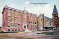 School and Church 01 St. Mary's Parish School, Melrose, MA, 1909-1982. Postcard of school and church. |