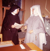 St. Rita's Parish School, Portland, OR, 1951-1972. Photo of school principal, M. Maria Immaculata, greeting visiting missionary M. John Bosco. |