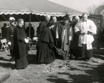 Laying Cornerstone 01 Academy of the Holy Child Jesus, Sharon Hill, PA, 1864-1973. Photo of Archbishop Kroll laying cornerstone and blessing classroom in new high school building. |