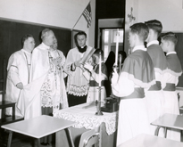 Laying Cornerstone 02 Academy of the Holy Child Jesus, Sharon Hill, PA, 1864-1973. Photo of Archbishop Kroll laying cornerstone and blessing classroom in new high school building. |