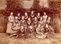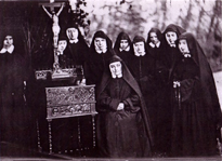 Raikes Hall 03 Layton Hill, Blackpool, England. Original of often used photos of Cornelia and community at Raikes Hall; future reproductions were often retouched, fixing her veil which had been blown by the wind and adding a silver cross. |