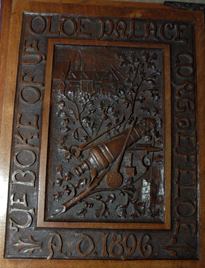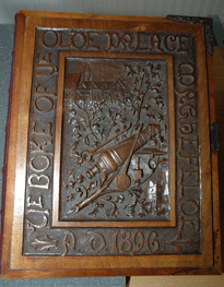 History of the "Olde Palace" 01 St. Leonards - Mayfield, Mayfield, Sussex, England. Originally Mayfield School of the Holy Child. Cover of book created by students and teachers; book covers history of the "olde Palace" from the 10th to 19th centuries; wooden cover carved by students; signature of Queen Victoria to commemorate her visit to Mayfield. |
