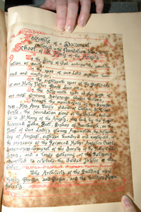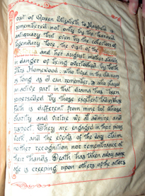 History of the "Olde Palace" 06 St. Leonards - Mayfield, Mayfield, Sussex, England. Originally Mayfield School of the Holy Child. Page of book created by students and teachers; book covers history of the "olde Palace" from the 10th to 19th centuries; wooden cover carved by students; signature of Queen Victoria to commemorate her visit to Mayfield. |