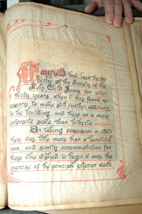History of the "Olde Palace" 05 St. Leonards - Mayfield, Mayfield, Sussex, England. Originally Mayfield School of the Holy Child. Page of book created by students and teachers; book covers history of the "olde Palace" from the 10th to 19th centuries; wooden cover carved by students; signature of Queen Victoria to commemorate her visit to Mayfield. |