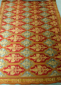 Tapestry Rug 01a St. Leonards - Mayfield, Mayfield, Sussex, England. Originally Mayfield School of the Holy Child. Tapestry rug designed by Pugin and stitched for Cornelia by SHCJ sisters for aisle of Mayfield Chapel. Stitched in panels then joined; originally ran entire length of chapel. Writing on border speaks of hidden God and delighting in him day and night. |