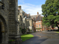 Front of School 02 St. Leonards - Mayfield, Mayfield, Sussex, England. Originally Mayfield School of the Holy Child. Photo of front of school with arched entry to chapel in foreground on left. |